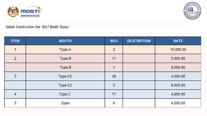 Booth rental ranges from RM 4,000 to RM 15,000 depending on dimension and location of booth (please refer to booth rental document for information).