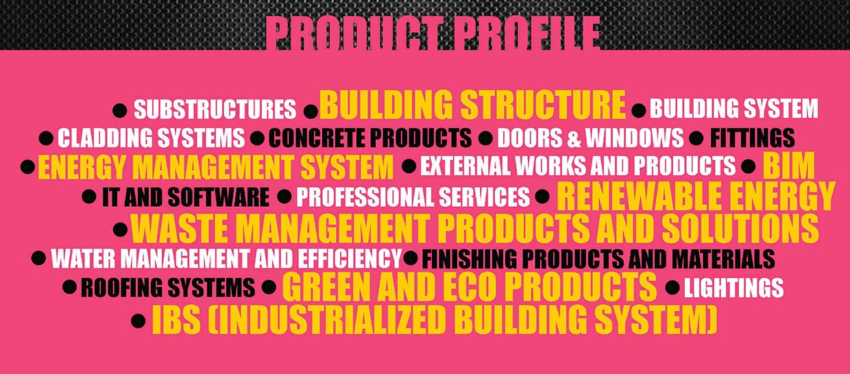 Products that will be showcased in this Sabah Construction Fair 2017 includes Renewable Energy, Waste Management Products and Solutions, Water Management and Efficientcy, Finishing Products & Materials, Roofing Systems, Green & ECO Products, Lightings, IBS (Industrialized Building Systems), and many more.
