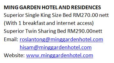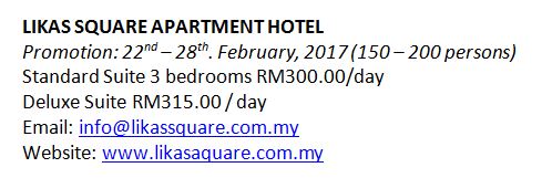 We are pleased to provide herewith the accommodation facilities with the following Hotels and Apartments for your stay in Kota Kinabalu, Sabah to participate in our Trade Fair from 24 - 26 February, 2017.